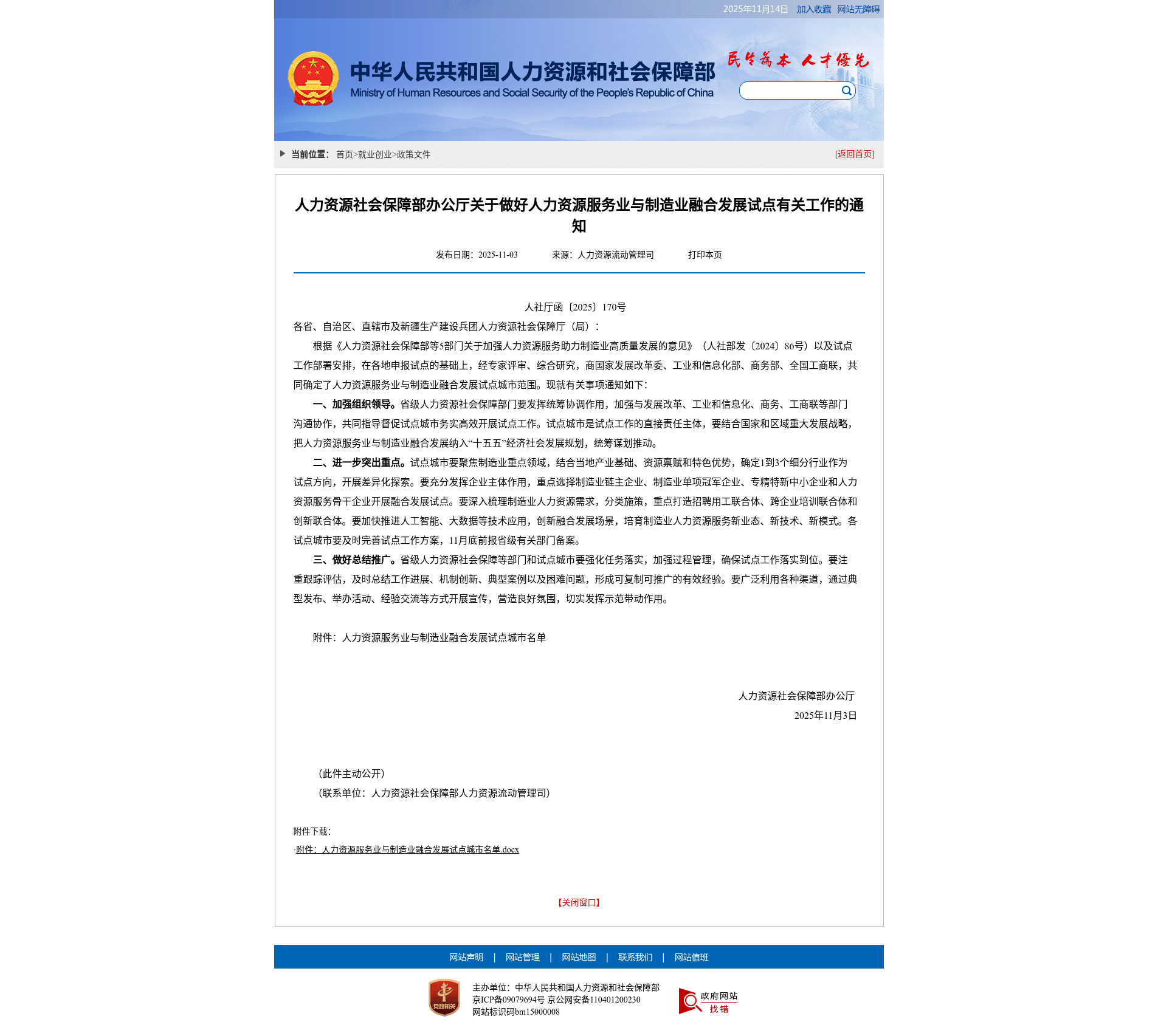 人力资源社会保障部办公厅关于做好人力资源服务业与制造业融合发展试点有关工作的通知