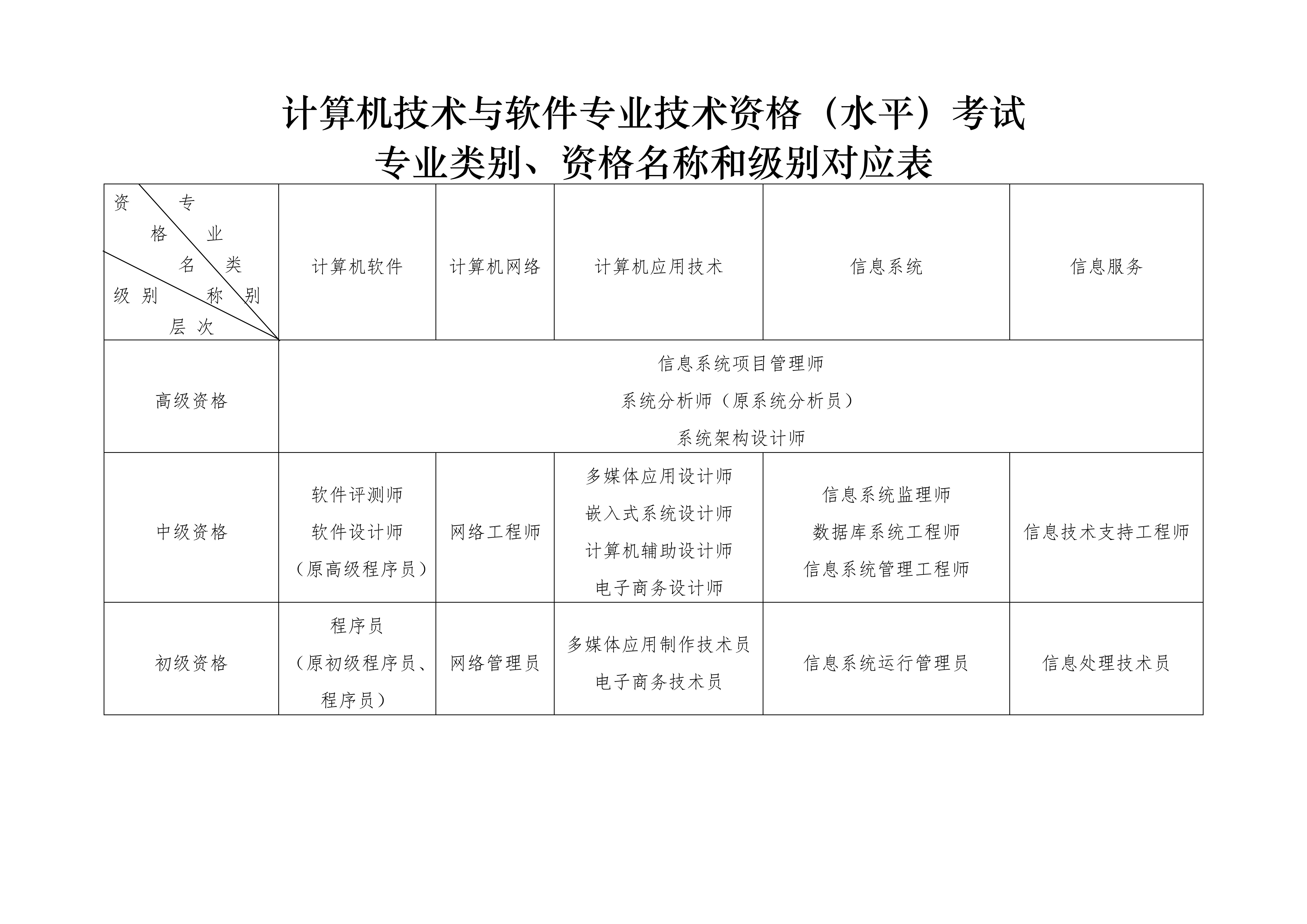 第四条 根据《计算机技术与软件专业技术资格(水平)考试暂行规定》(以下简称《暂行规定》)第五条规定,计算机专业技术资格(水平)考试划分为计算机软件、计算机网络、计算机应用技术、信息系统和信息服务5个专业类别,并在各专业类别中分设了高、中、初级专业资格考试,详见《计算机技术与软件专业技术资格(水平)考试专业类别、资格名称和级别层次对应表》(附后)。人事部、信息产业部将根据发展需要适时调整专业类别和资格名称。